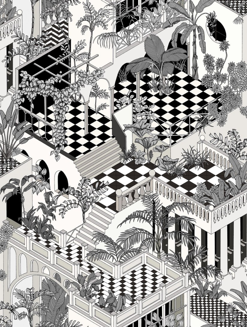 Tropinio retro stiliaus centrui duoklę atiduodantis gyvybingas raštas „Miami“ – kolonomis papuoštos terasos ir vešli augmenija. Raštą galima rinktis iš dviejų atspalvių: anglies ir sniego baltumo, jeigu norite sukurti drąsų stilių, arba pastelinio, primenančio Pietų paplūdimio kreidos atspalvio statinius ir žavaus kičo atmosferą.