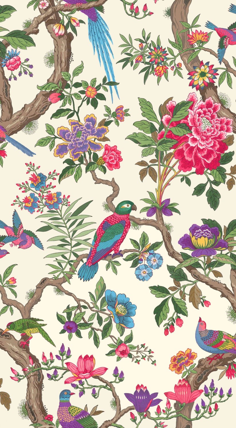 Ant šių tapetų pavaizduotas nuostabaus grožio vešlus gyvybės medis, o juos sukurti įkvėpė Fontenblo rūmai už Paryžiaus. Į akis krinta lapotos šakos, ant kurių tupi egzotiški įvairiaspalviai paukščiai. Šiuos įspūdingo dizaino tapetus galite įsigyti dviejų spalvinių derinių: su švelniai rausvu atspalviu žydrame fone arba fuksijų ir sodriai žalios spalvos neutraliame fone.