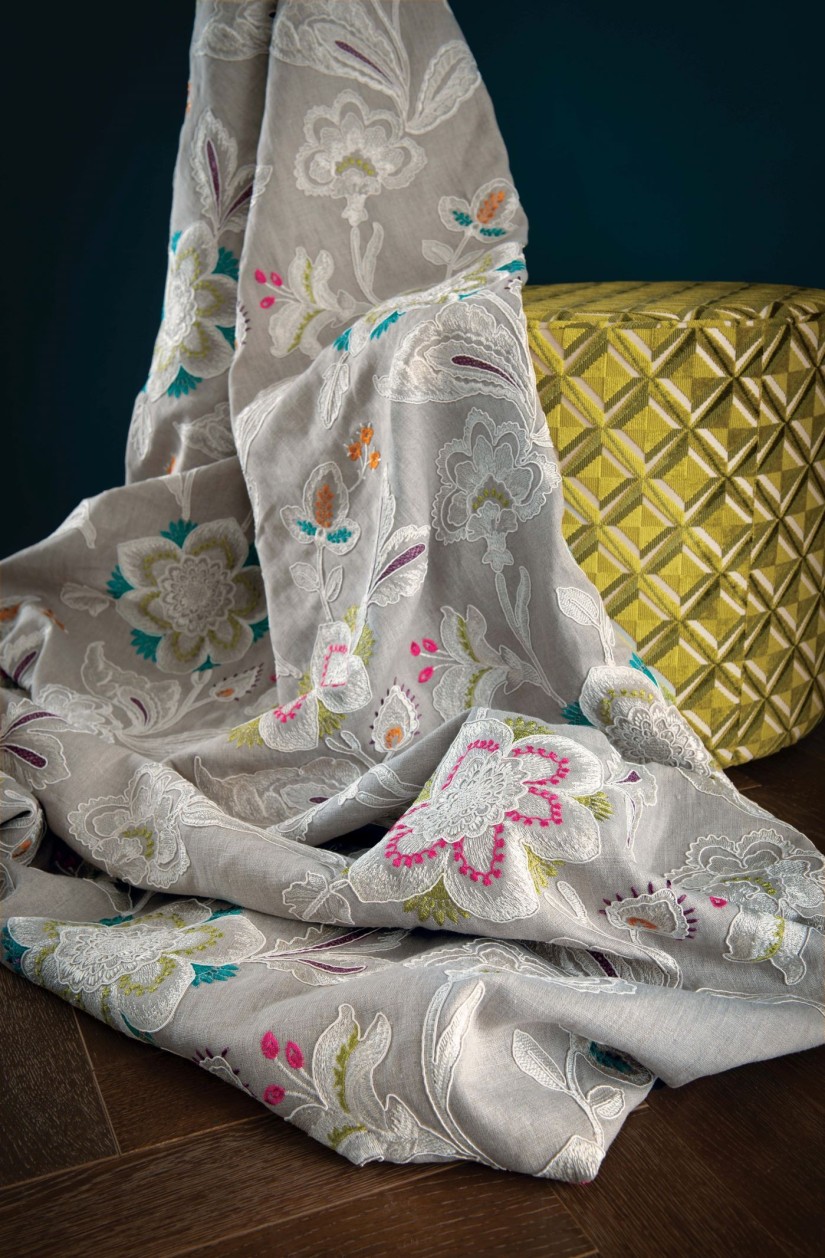Rožės ir lelijos yra laisvai išsiuvinėtos rumbelių kontūrų viduje ant lininio pagrindo. Sudėtingas, nėrinius primenantis gėlių raštas yra pagyvintas brangakmenių spalvų akcentais.