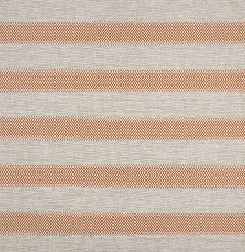 Horizontalus žakardinis dryžuotas audinys, sudarytas iš kintamų ryškių rombų ir eglutės formų juostų, kontrastuojančių su lino spalvos pagrindu.