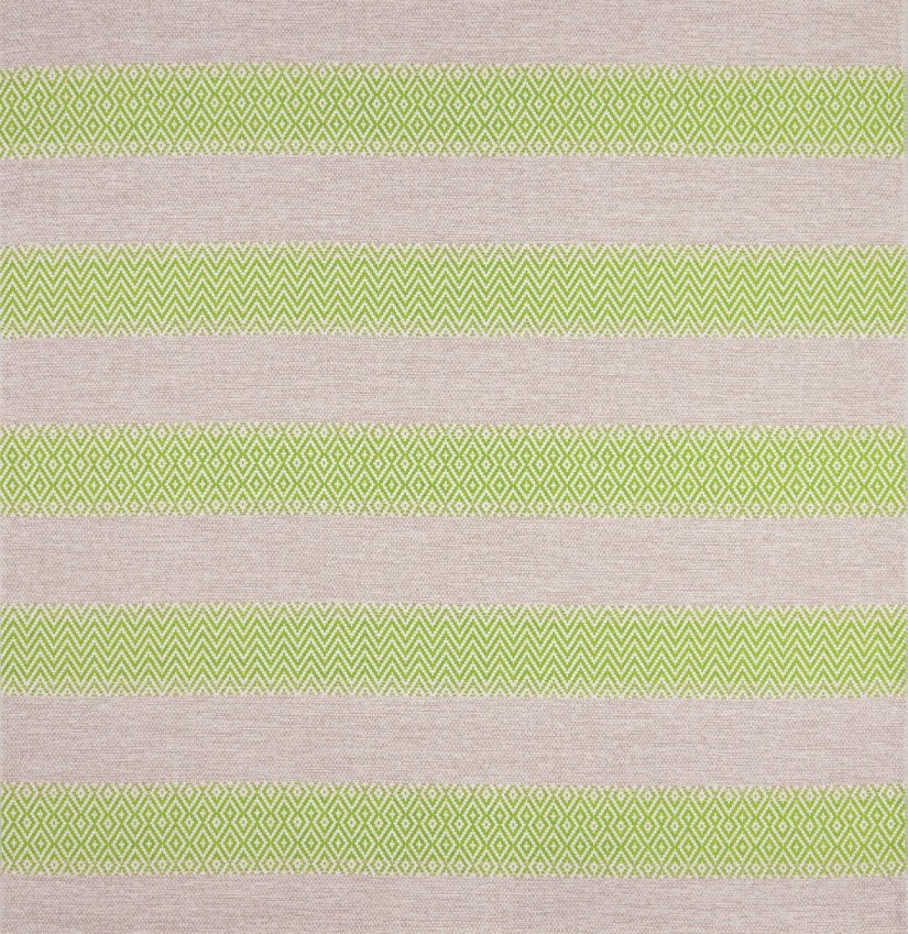 Horizontalus žakardinis dryžuotas audinys, sudarytas iš kintamų ryškių rombų ir eglutės formų juostų, kontrastuojančių su lino spalvos pagrindu.