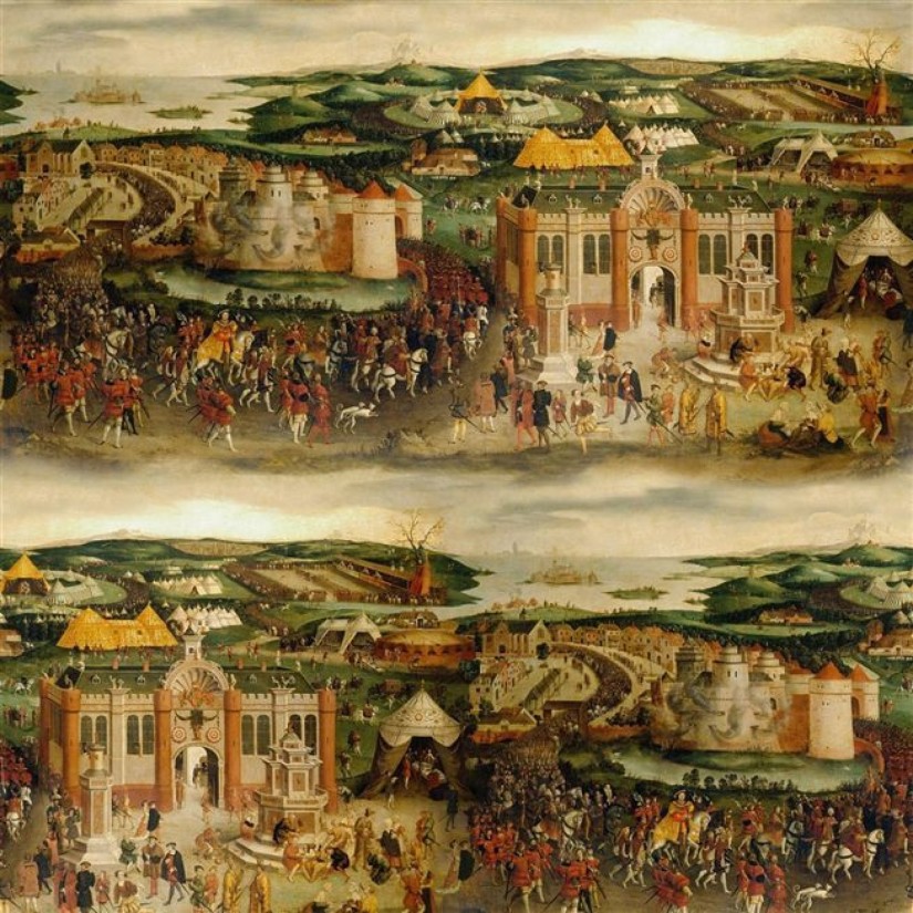 Turtingas, šiltas, didelio pločio, skaitmeniniu būdu spausdintas fonas, pilnas auksinių tonų ir rudens spindesio. XVI a. Paveikslas „Auksinės audinio laukas“, iš pradžių nutapytas Henrikui VIII, vaizduojantis jo ir Pranciškaus I susitikimą, vykusį 1520 m. birželio mėn. Val d'Or slėnyje. Spausdintas ant plataus ir plečiamo 140 cm pločio, lengvai pakabinamo, plaunamo neaustinio popieriaus. Mūsų unikalios tekstūros popierius, džiuginantis delnus ir akis, suteikia minkšto rankų darbo pergamento pojūtį.