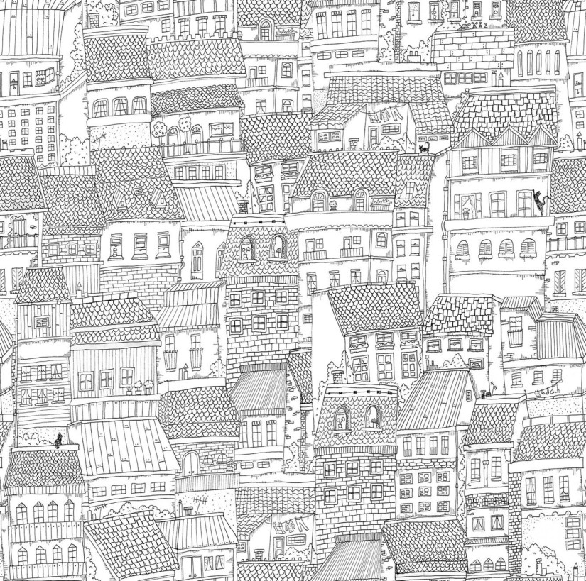 Miestas, kuriame pildosi svajonės. „Dream Town“ – rankomis pieštas tapetų raštas su daugybe nuostabių detalių, kurias reikia atrasti. Įdomu, ko katė ieško? Nori žaisti?