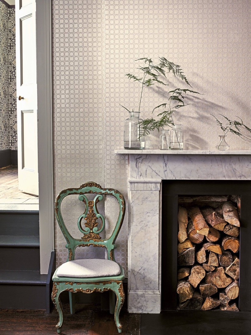 Grotelės, supintos iš mažyčių reljefinių žiedelių ir kvadratėlių. Šis raštas – tai aksominio audinio, pristatyto kolekcijoje „Savoy Velvets“, interpretacija.