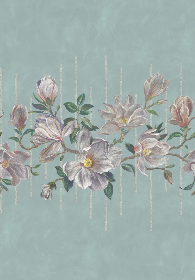 Pagal rankomis tapytą iliustraciją išdidinti magnolijų žiedai ir lapai yra perkelti ant sienos vidurio, priešais grakščius bambuko stiebus. Magnolijos yra vaizduojamos medžio anglies arba akvamarino atspalvio fone. Kiekvieną ruloną sudaro trys greta viena kitos klijuojamos juostos.