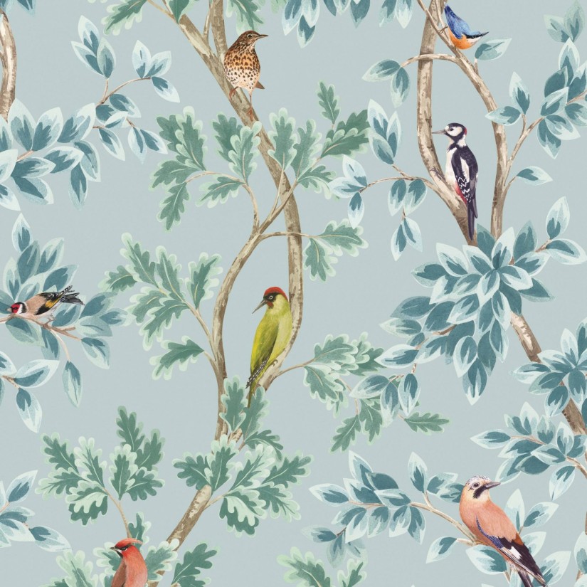 Geniai, kėkštai, mėlynosios zylės ir kiti sodo paukščiai nutūpę dviejų lapuočių medžių šakose.