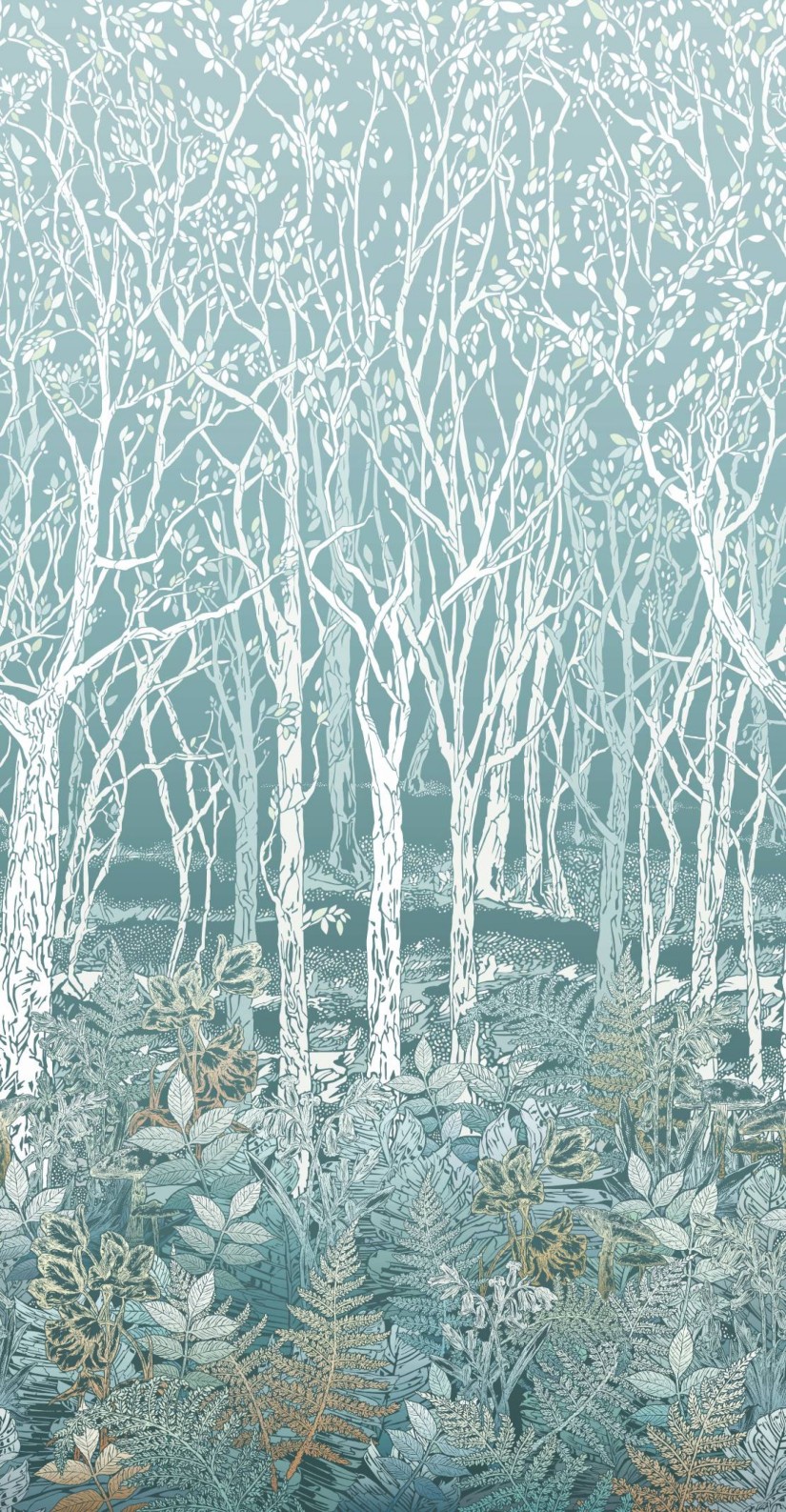 Mįslinga miško scena su paparčių, scylių, laukinių tulpių ir šungrybių kilimu pateikiama kaip medžio raižinio raštas su ombrė spalvos medžiais, lapija ir fonu.
