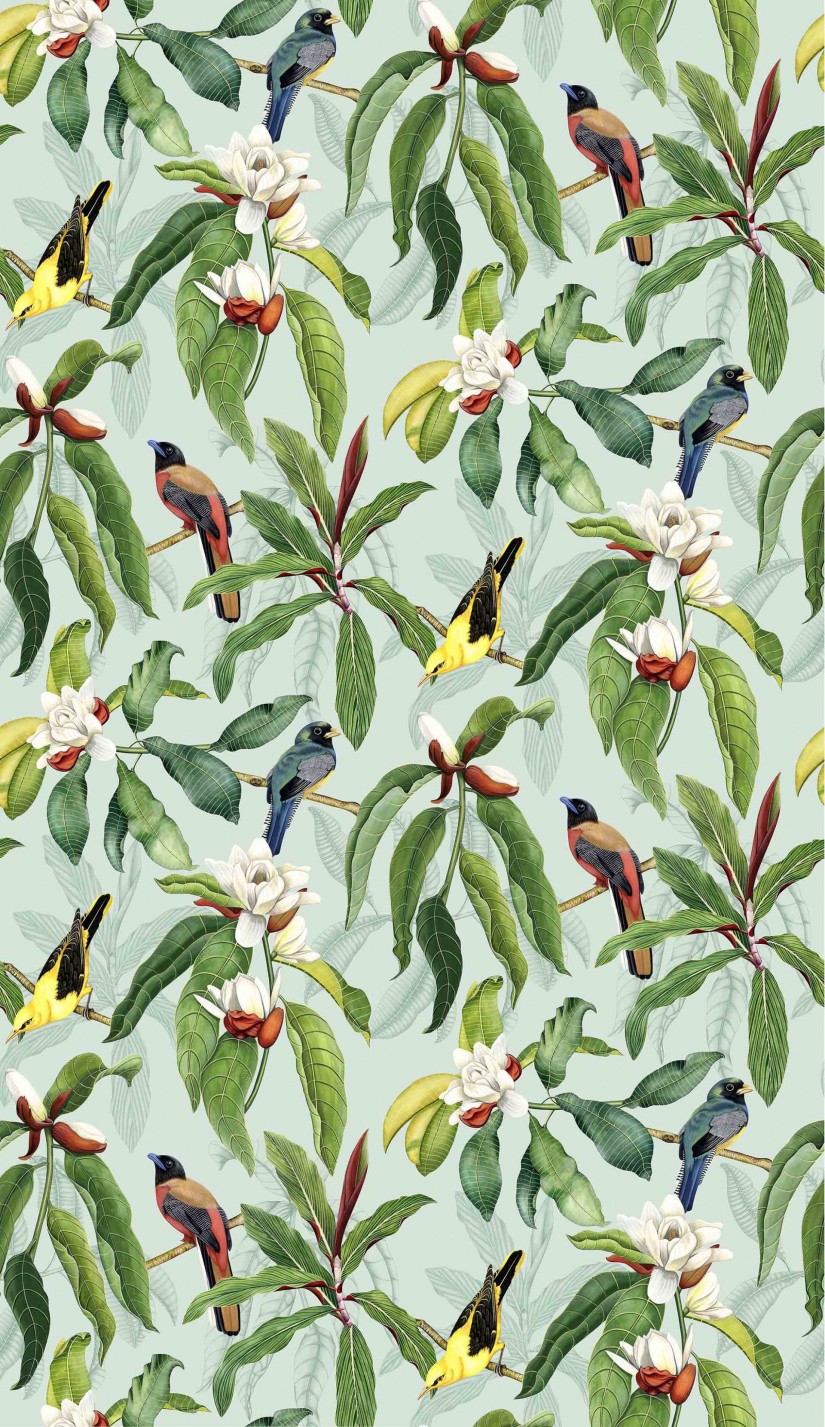 Egzotiški paukščiai tupintys žydinčios magnolijos medžio šakose. Tapetų pano nupieštas akvarele ir pieštuku. Magnolijos žiedų įvairovė. \r\n