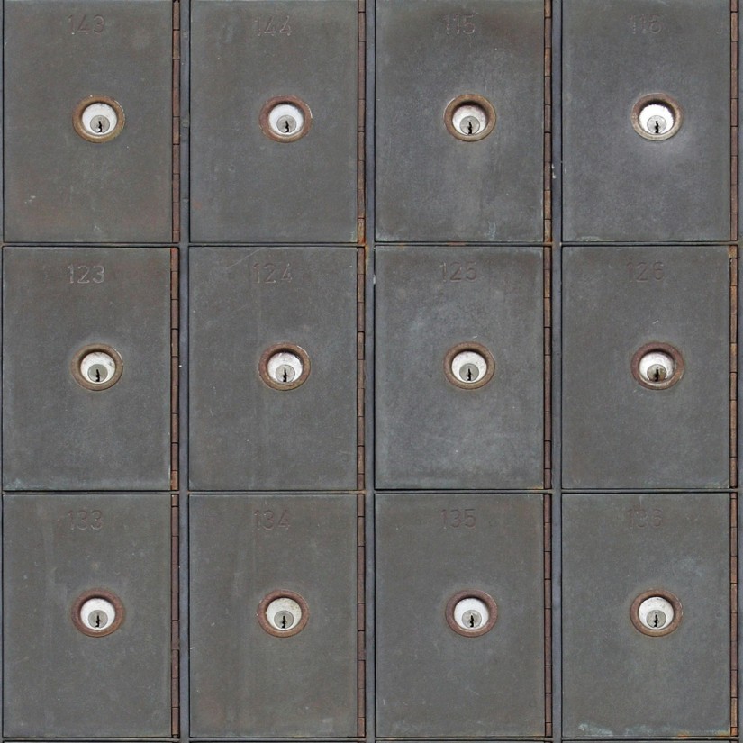 Pasikartojantis raštas, sukurtas iš pramoninio stiliaus užrakinamų spintelių.