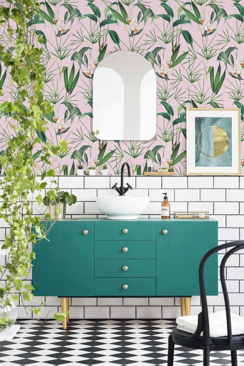 Prabangi tropinės lapijos kompozicija, įkvėpta egzotiškų palmių sodų.
