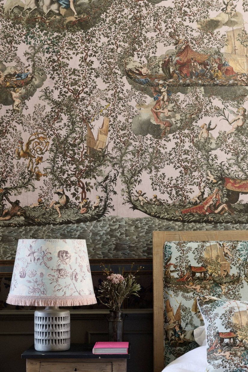 Šie pasakiški Renesanso stiliaus raštai buvo sukurti kaip madingi trijų ritinių tapetai „Manor“ kolekcijos miegamajam kambariui. Juose vaizduojamos rankomis dažytos angelų ir dievų graviūros, taip pat prabangūs dekoratyviniai daiktai, kuriuos maždaug 1700 m. sukūrė vokiečių menininkas Johannas Georgas Wolfgangas. Taip pat galima įsigyti lininio audinio šviesiai mėlynos spalvos tapetus.