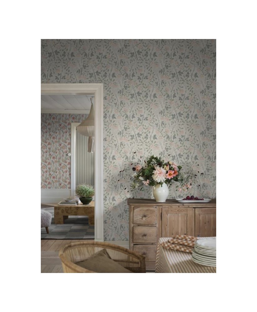 Šie žavūs Trädgårdsfröjd tapetai vaizduoja abrikosų rožines ir baltas gėles su žaliais lapais švelniame smėlio spalvos fone. Romantiškas dizainas įkvėptas vešlaus dizainerės Noros Tysklind sodo Dalarnoje, Švedijoje, kuriame gėlės laisvai žydi ir persipina viena su kita.