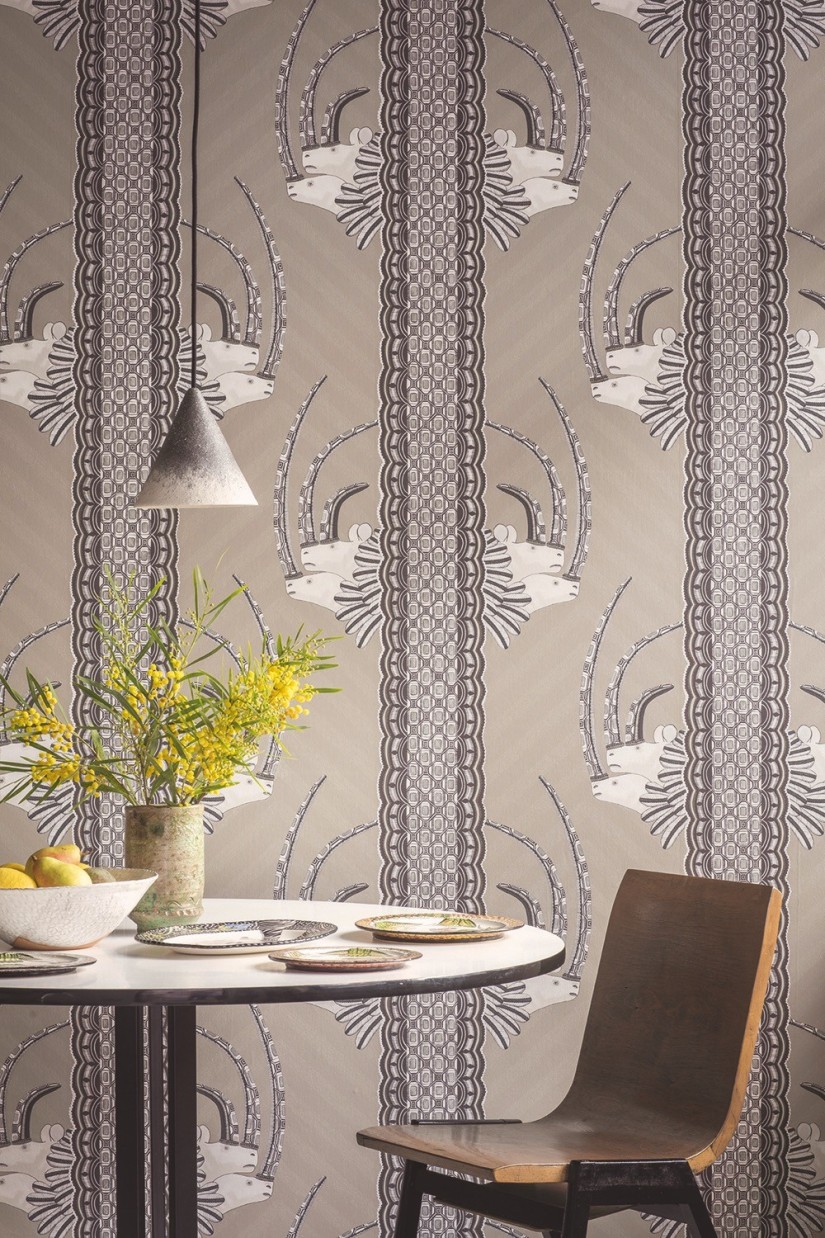 Pavadintas vieno geriausių „Ardmore" dizainerių Jabu Nene vardu, šis dizainas įkvėpimo semiasi iš nuostabių skulptoriaus Somandla Ntshanlintshali sukurtų indus apraizgiusių skulptūrinių raganosių. Po to tie puodai akinančio ryškumo spalvomis buvo sudėtingai ištapyti pačios Jabu Nene, ir dabar tai yra vienas mėgstamiausių firminis „Ardmore" modelis. Mūsų „Cole and Son" menininkai panaudojo šių puodų ženklus kurdami nuostabų vertikalių gyvų juostų dryžuotą audinį, iš kurio žvilgčioja didingų baltų raganosių su puošniais ragais ir plunksnomis pora. Šie tapetai pasižymi tikra Afrikos dvasia, o jų raštai primena Zulu krepšelio pynimą. Tapetai siūlomi penkių įspūdingų spalvų derinių, tarp kurių elegantiški juodi, balti ir pilki neutralūs atspalviai šalia praktiškų alyvų, tabako ir tamsiai mėlynų bei oranžinių tonų.