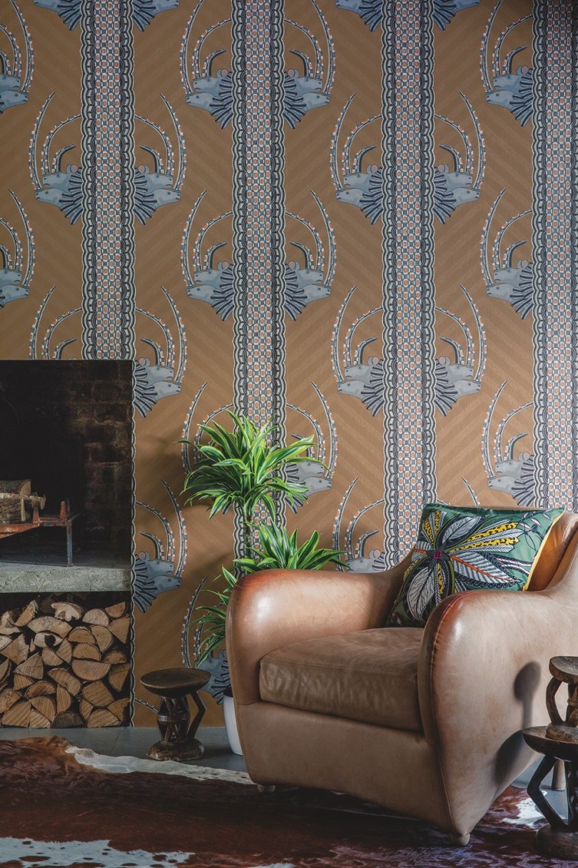Pavadintas vieno geriausių „Ardmore" dizainerių Jabu Nene vardu, šis dizainas įkvėpimo semiasi iš nuostabių skulptoriaus Somandla Ntshanlintshali sukurtų indus apraizgiusių skulptūrinių raganosių. Po to tie puodai akinančio ryškumo spalvomis buvo sudėtingai ištapyti pačios Jabu Nene, ir dabar tai yra vienas mėgstamiausių firminis „Ardmore" modelis. Mūsų „Cole and Son" menininkai panaudojo šių puodų ženklus kurdami nuostabų vertikalių gyvų juostų dryžuotą audinį, iš kurio žvilgčioja didingų baltų raganosių su puošniais ragais ir plunksnomis pora. Šie tapetai pasižymi tikra Afrikos dvasia, o jų raštai primena Zulu krepšelio pynimą. Tapetai siūlomi penkių įspūdingų spalvų derinių, tarp kurių elegantiški juodi, balti ir pilki neutralūs atspalviai šalia praktiškų alyvų, tabako ir tamsiai mėlynų bei oranžinių tonų.