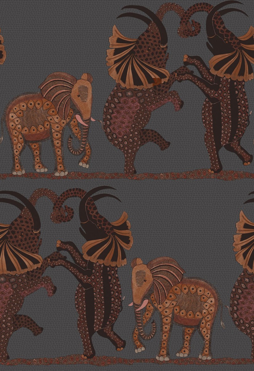 Šiuose gražių raštų tapetuose vaizduojamas dramblių trejetas, horizontaliai šokantis Afrikos lygumose. Sudėtingai sukurti, jie yra paimti iš Zinhle Nene nutapytos didelių dekoruotų urnų serijos, kuri užima garbingą vietą „Ardmore" muziejuje. Spalvos išlaikytos gana paprastos todėl, kad buvo norima parodyti smulkius rankomis tapytus elementus – medžio anglies, smėlio ir akmens spalvos suteikia švelnų margą foną juodai ir baltai, neryškiai tamsiai raudonai ir rūdžių bei šaltos kreidos pilkumo spalvoms.