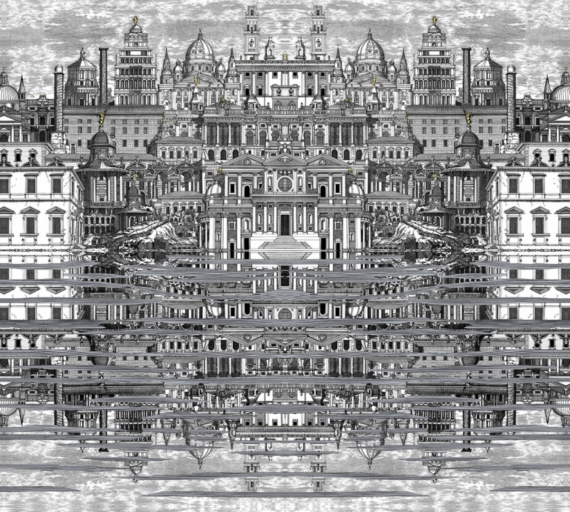 „Riflesso“ – tai atmosferinis atspindys, vaizduojantis barokinę Romą, kurią siurrealistine akimi Fornasetti matė maždaug 1955 m. Dešinioji pusė yra kairiosios pusės veidrodinis atvaizdas, atsispindintis vandenyje. Galima įsigyti juodos ir baltos spalvų su šaltais sidabriniais akcentais tapetus.