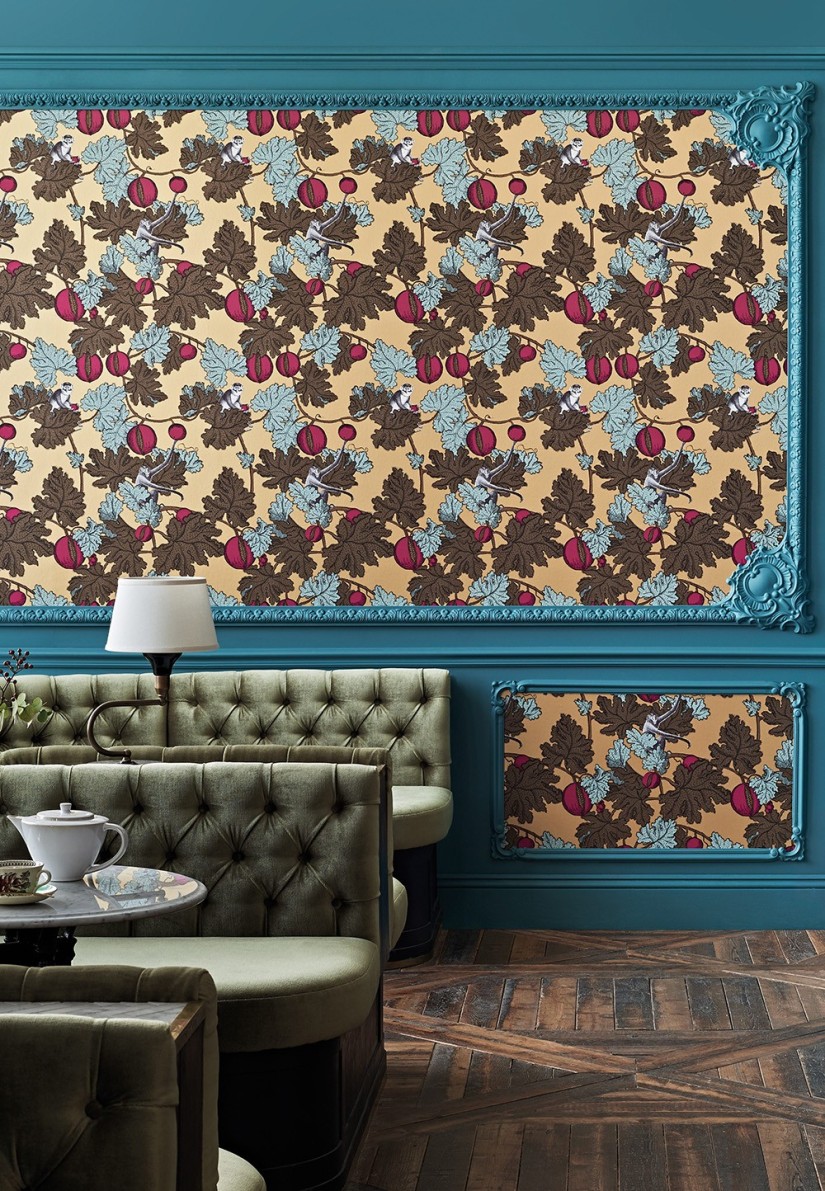 „Frutto Proibito“ nuostabiai dera skirtingi XX-ojo amžiaus 5-ojo ir 6-ojo dešimtmečių archyviniai Fornasetti motyvai. Išdykusios beždžionės, iš pradžių sugalvotos kaip įspūdingos medinės plokštės Milano konditerijai, Dulciora, sėdi tarp išsišakojusių granatų medžių šakų. Žaisminga augmenijos ir gyvūnijos kompozicija yra tikrasis Fornasetti stilius, kuriame dera tikroviškos graviūros ir dekadentiški, ryškūs raštai. Tamsus rašalo ir aukso pagrindas akcentuoja uždraustus violetinius slyvų vaisius, o žydros ir oranžinės spalvos siūlo ryškią, saulėtą alternatyvą.