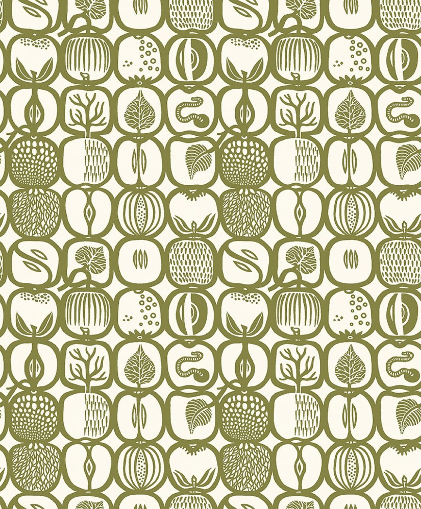 Švelnios alyvuogių žalumos, žaismingi „Fruktlåda“ tapetai suteikia kambariams džiaugsmo ir humoro. Išvertus iš švedų kalbos reiškia „vaisių dėžė“. Šis klasikinis vaisių kolekcijos retro raštas yra vienas populiariausių švedų dizainerio Stigo Lindbergo raštų. Idealus variantas sukurti nesenstantį ir šiuolaikišką skandinavišką stilių savo svetainėje, koridoriuje ar virtuvėje.