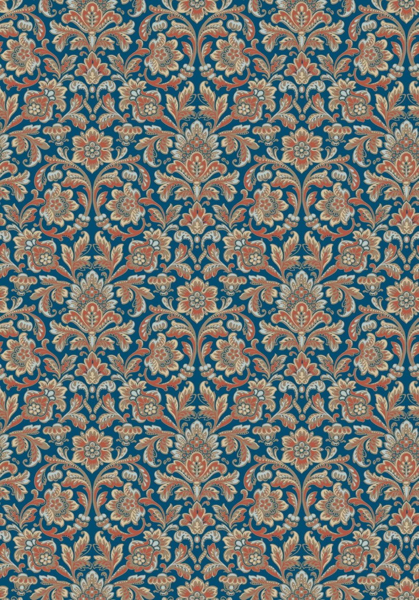 Arti vienas kito išdėstyti medaliono raštai, nuspalvinti sodriais bronziniais ir mėlynais tonais, įkvėpti XIX a. pabaigos interjero stiliaus. Tamsiai mėlyname fone vinguriuojantys kruopščiai išpiešti raštų motyvai skleidžia švelnų švytėjimą. Didingi, bet akies nerėžiantys tapetai nuostabiai papildys mielą šiuolaikiško stiliaus paprastumą.