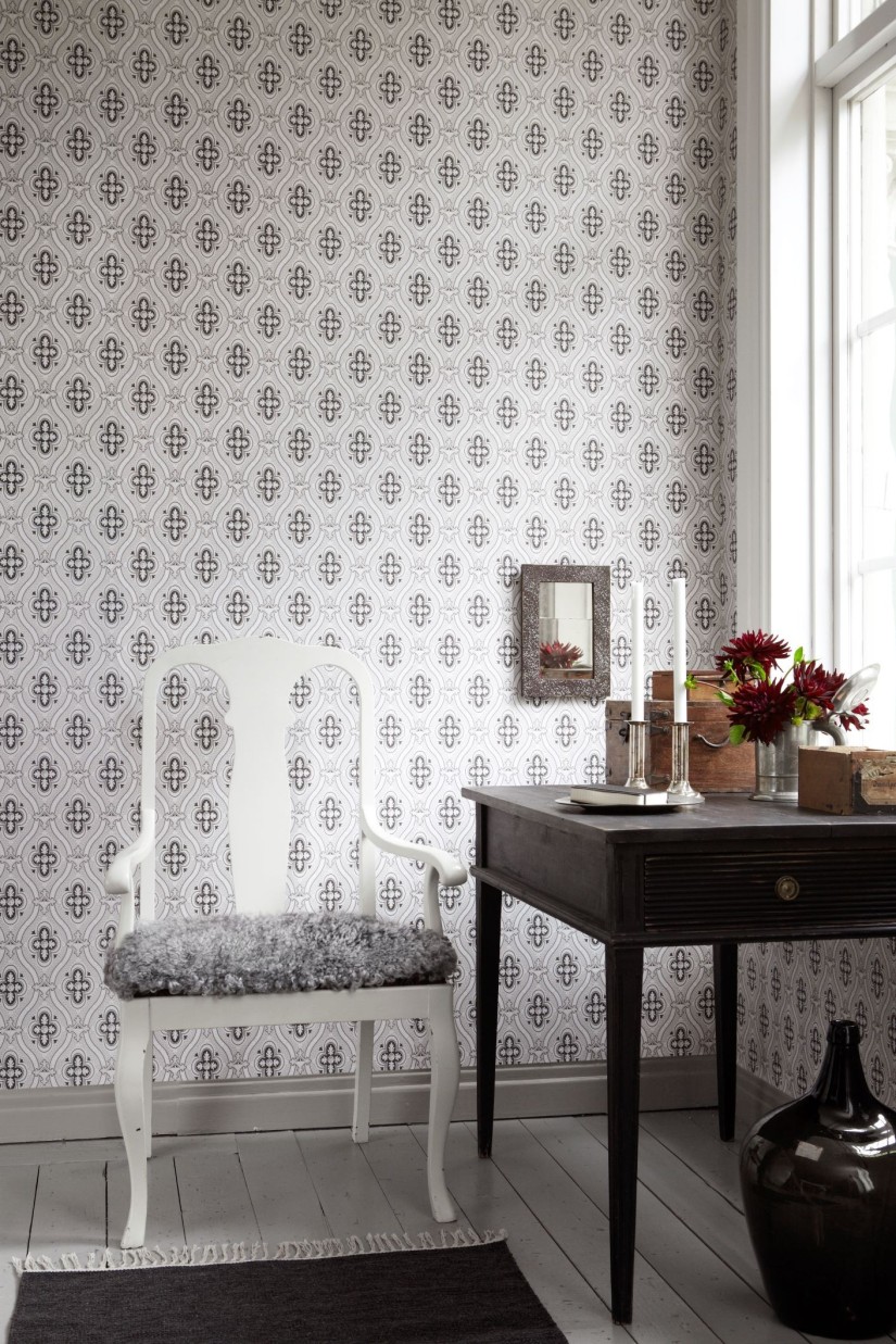 Stilingus ornamentuotus tapetus, kadaise puošusius XIX a. aristokratų namų sienas, primenantis raštas „Pigkammaren“ vis pasikartoja. Baltos detalės paliestos šviesos subtiliai švyti, o kontrastingi juodi tonai paverčia šį atspalvį drąsiausia šių raštų versija.