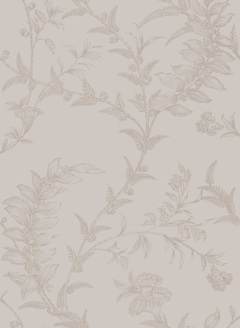XVIII a. menantis raštas, kuriuo buvo papuoštas Viljamsburgo kolonijai sukurtas audinys. Galite rinktis iš penkių grakščiai siūbuojančių šakelių atspalvių: baltų neutraliame rusvai pilkame fone, baltų melsvai pilkšvame fone, vario spalvos gelsvame fone, sidabrinių pilkame fone ir anglies spalvos natūraliame baltame fone