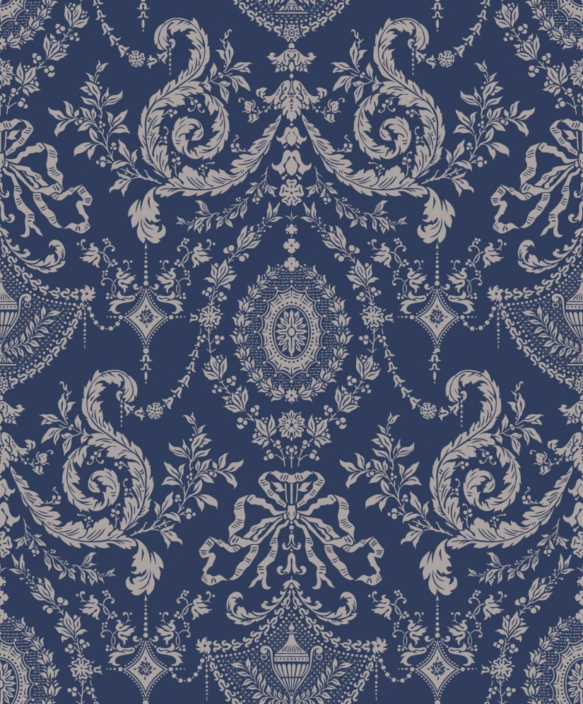 XVIII a. smulkų šilko raštą atkartojantys tapetai nuspalvinti trimis atspalviais: šiltu sidabro melsvai žalsvame fone, baltu blizgiame šampano spalvos fone ir šiltu sidabro mėlyname fone.