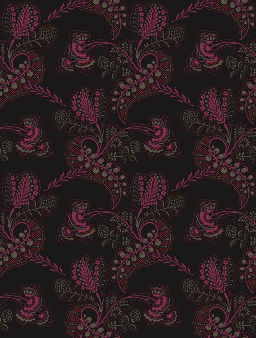 Keturių spalvų šilkografijos būdu atspausdintas vingiuojantis stilizuotų gėlių ornamentas. Yra trys atspalviai: rausva, oranžinė, vario ir pilka spalva beveik juodame fone, rusva, kreminė, rausva, plieno pilkšva melsvai žaliame fone, rusvai pilka, rausva, balkšva tamsiame kreminiame fone.