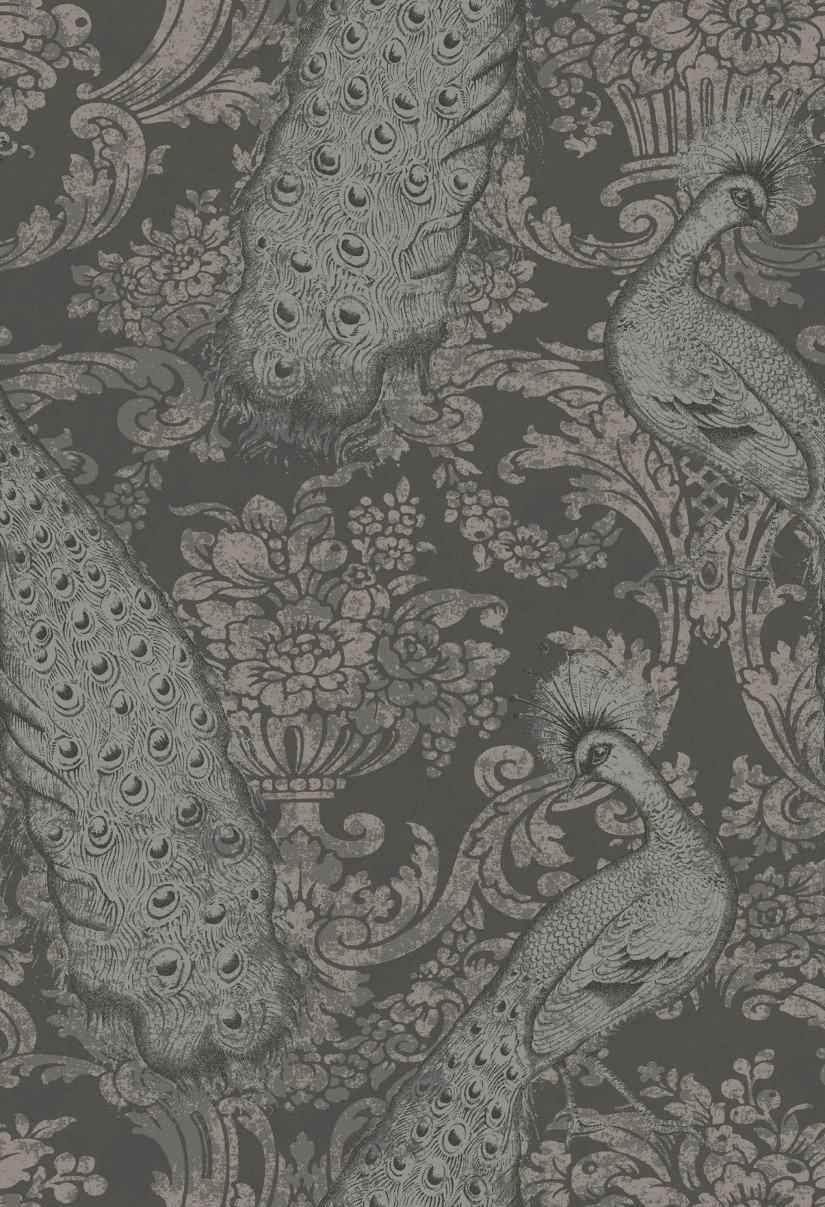 Elegantiškas ir egzotiškas damaskinis tapetas su prabangiais, metalizuotais povais. Raštą įkvėpė Viktorijos meilė ornamentiniams paukščiams.