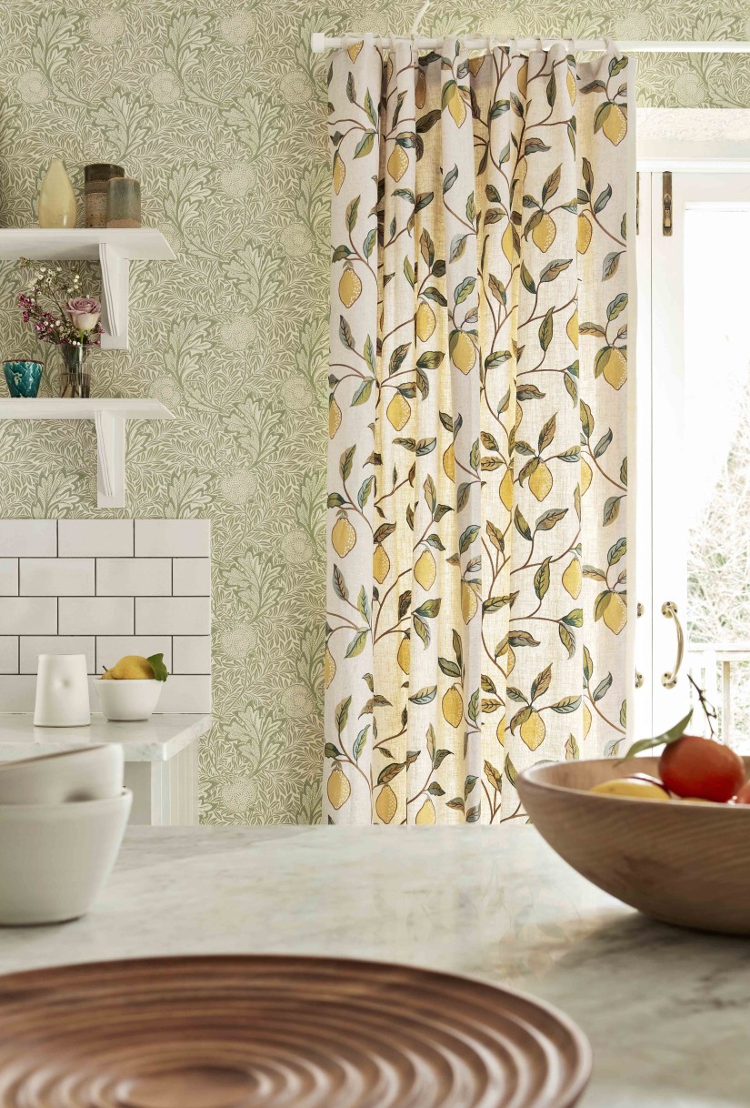 Šiame rašte vaizduojami besigarbanojantys akanto lapai ir dėmėti vaisiai. Williamas Morrisas šį raštą sukūrė 1877 m. ir juo ištapetavo May Morris darbo kambarį jo Hammersmith namuose. Gražus blokinis spausdinimas tapetui „Apple“ suteikia subtilių detalių. Raštas atkurtas penkiais naujais spalviniais variantais.