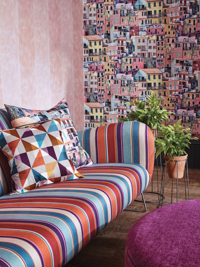 Viskozės siūlais ant lino išsiuvinėti trikampiai motyvai primena spalvotas bures. Busana – tai menininkų kaimelis netoli Ligūrijos sienos su Prancūzija.