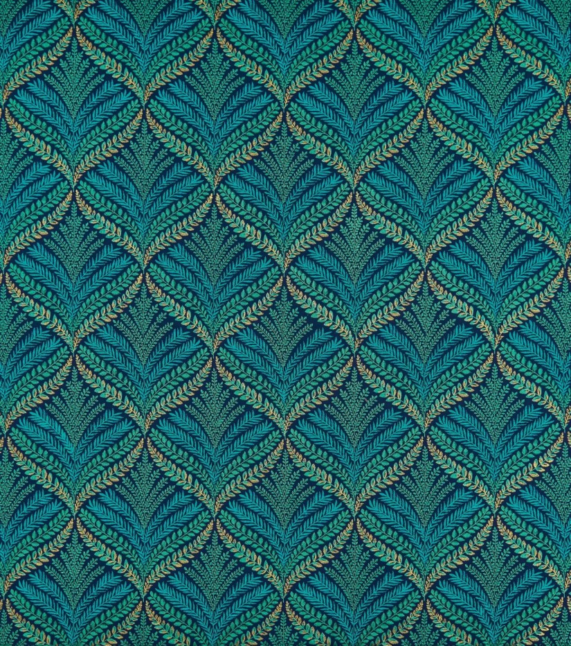 Paparčio lapai, išdėstyti simetriškomis formomis, yra išsiuvinėti į metmenis panašiomis siūlėmis ant lininio pagrindo.