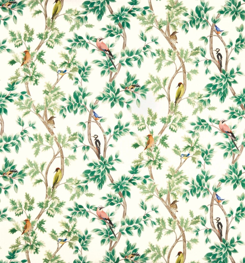 Geniai, kėkštai, mėlynosios zylės ir kiti sodo paukščiai nutūpę dviejų lapuočių medžių šakose. Rankų darbo raštas yra skaitmeniniu būdu atspaustas ant lino ir tvilo pagrindo.