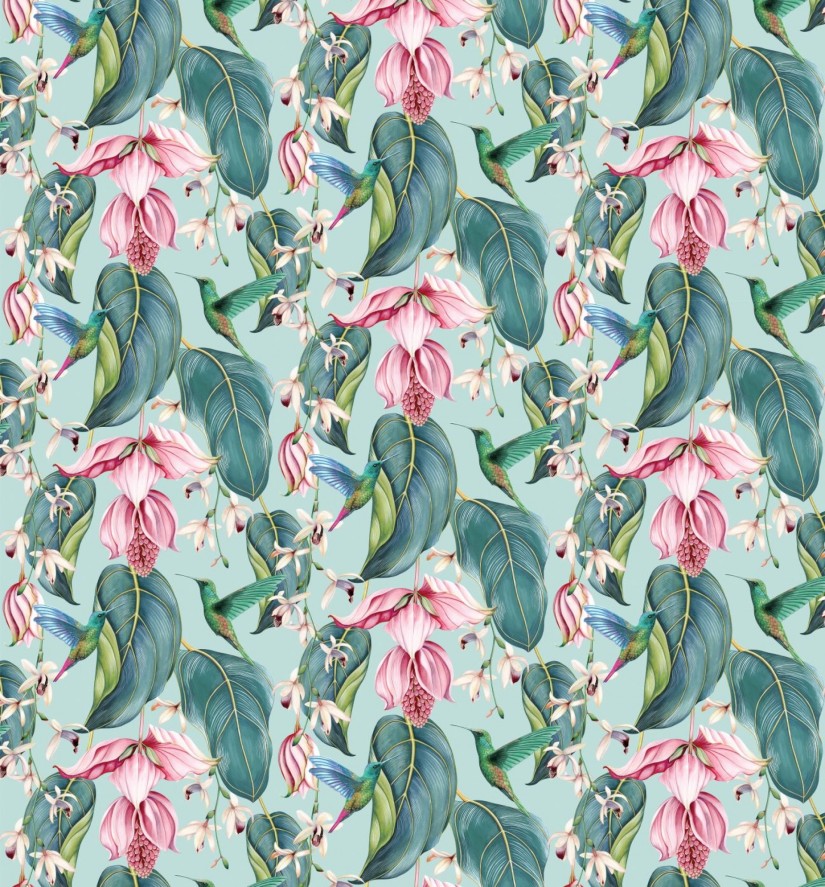 Kolibriai su egzotiškomis plunksnomis tarp besidriekiančių orchidėjų. Geriausiai parduodamas tapetų modelis yra naudojamas kaip lauko audinys.
