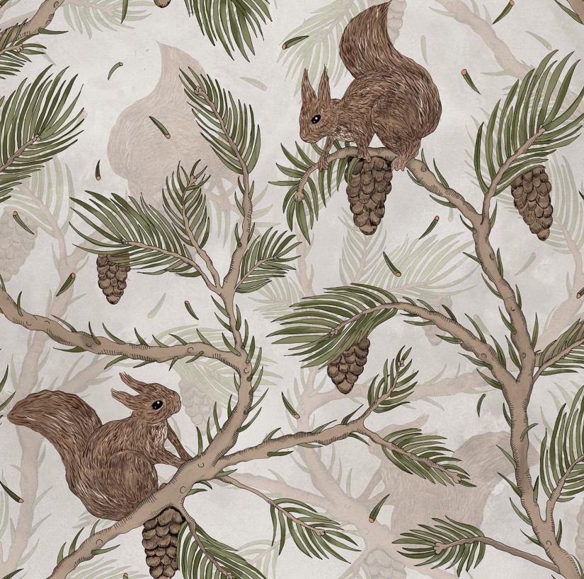 „Squirrel Mountain“ vaizduoja žaismingas voverytes šokinėjančias didelės pušies spyglių lajoje. Galbūt jos ieško skaniausio kankorėžio?