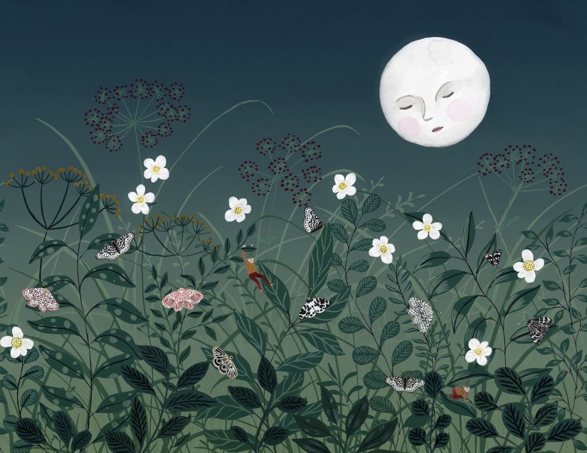 Vėjas pučia, o mėnulis šviečia. Draugiškas mėnulis stebi, kaip tarp gėlių ir sodrios žalumos žaidžia nykštukai. Tapetų raštas atspausdintas ant gražaus tamsiai mėlynos spalvos fono.