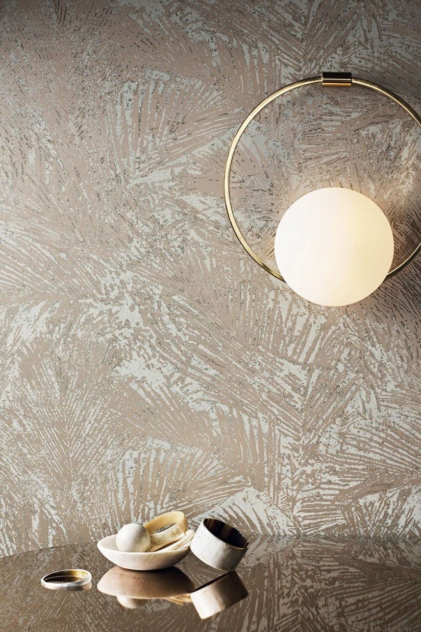 Tankios palmių šakelės sukuria egzotišką vaizdą; tapetuose „Areca" įlieta žvilgančio metalo spalva ir plati spalvų gama, kintanti nuo praktiškų neutralių iki brangakmenių atspalvių.