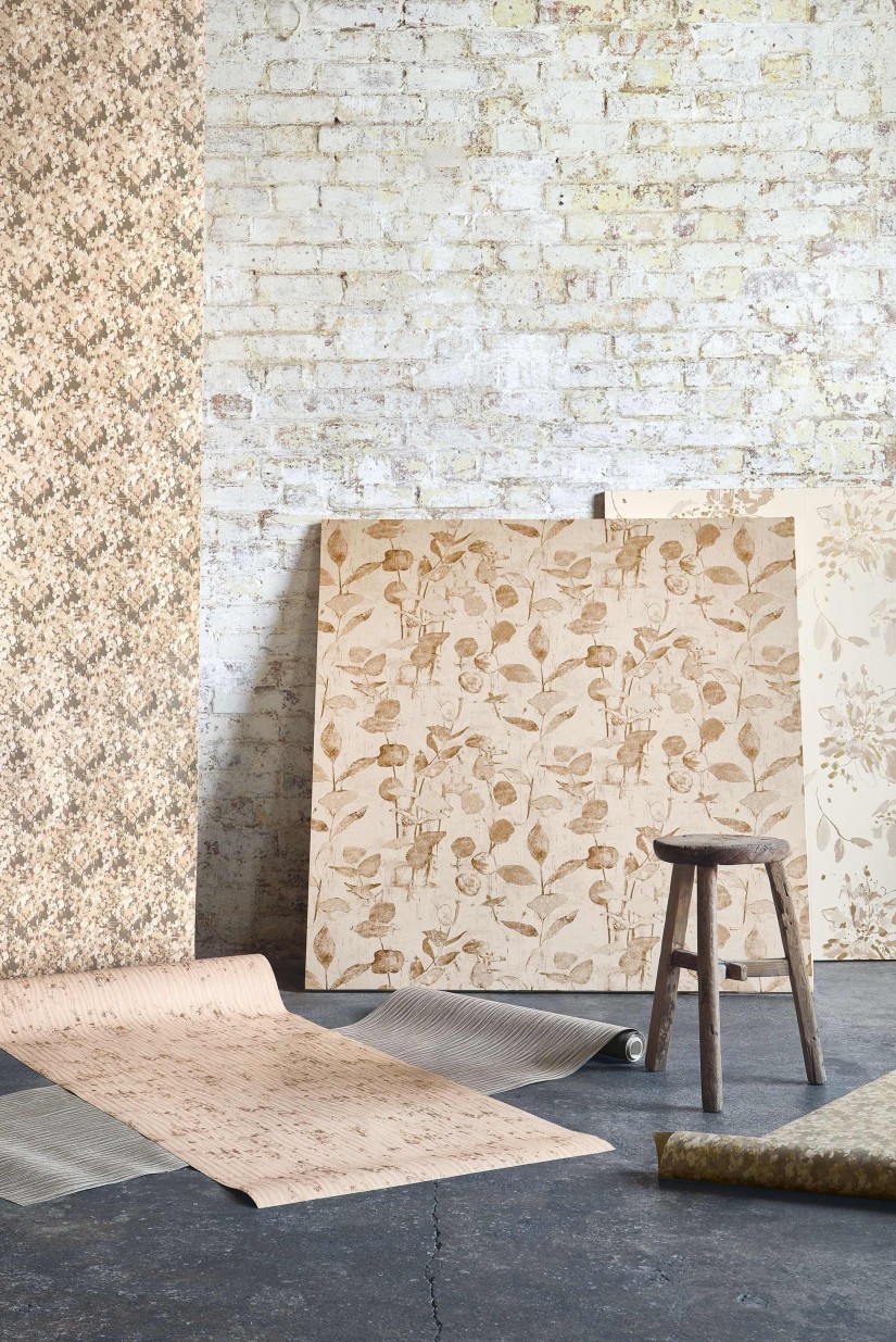 Elegantiškai kabantys eukalipto lapai išryškina akvarele tapyto kūrinio minkštumą. „Berea“ tapetuose naudojami subtilūs metaliko arba perluotės paryškinantys elementai, švelniai atspindintys šviesą ir pridedantys šiems sofistikuotiems tapetams naują matmenį.