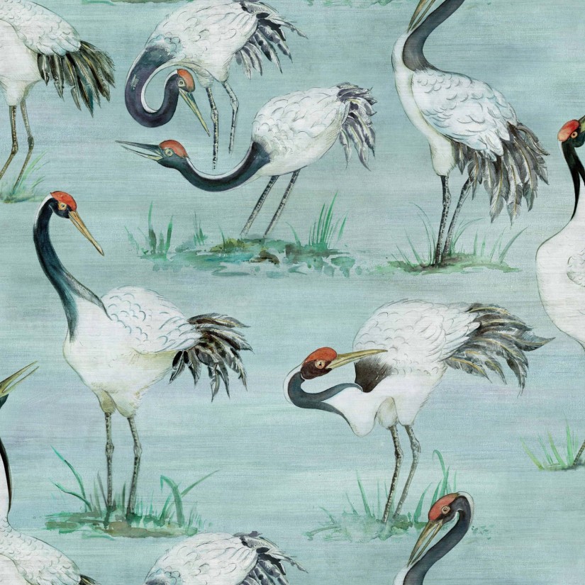 Mandžiūrijos gervės, susirinkusios pelkyne ir žuvaujančios tarp vandens žolių.