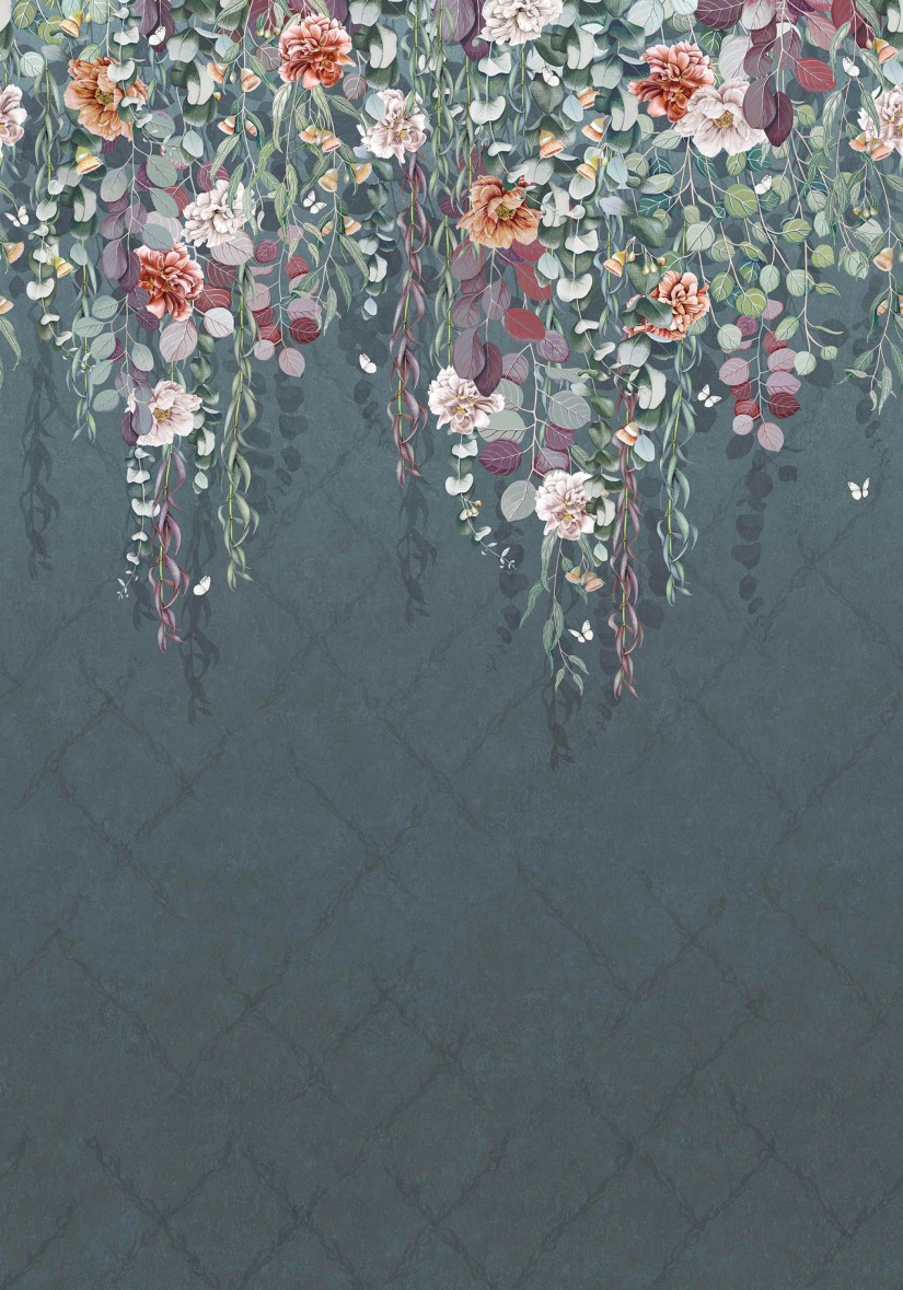 Žydintys eukaliptai persipina su bijūnų žiedais ir mažais baltais drugeliais.