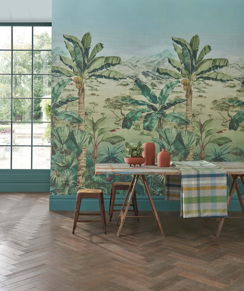 Vešlios bananų palmės ir tolumoje atsiveriantis panoraminis kraštovaizdis su kalnais.