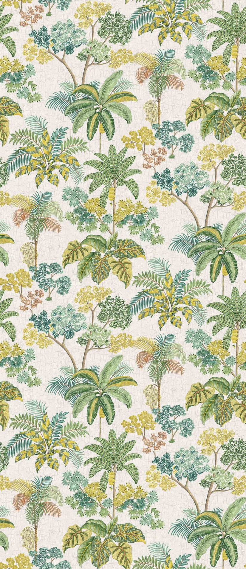 Gražus elegantiškų medžių, bananų ir palmių peizažas nutapytas ant fono primenančio suskilinėjusio lako faktūrą. Senųjų freskų prisiminimas.
