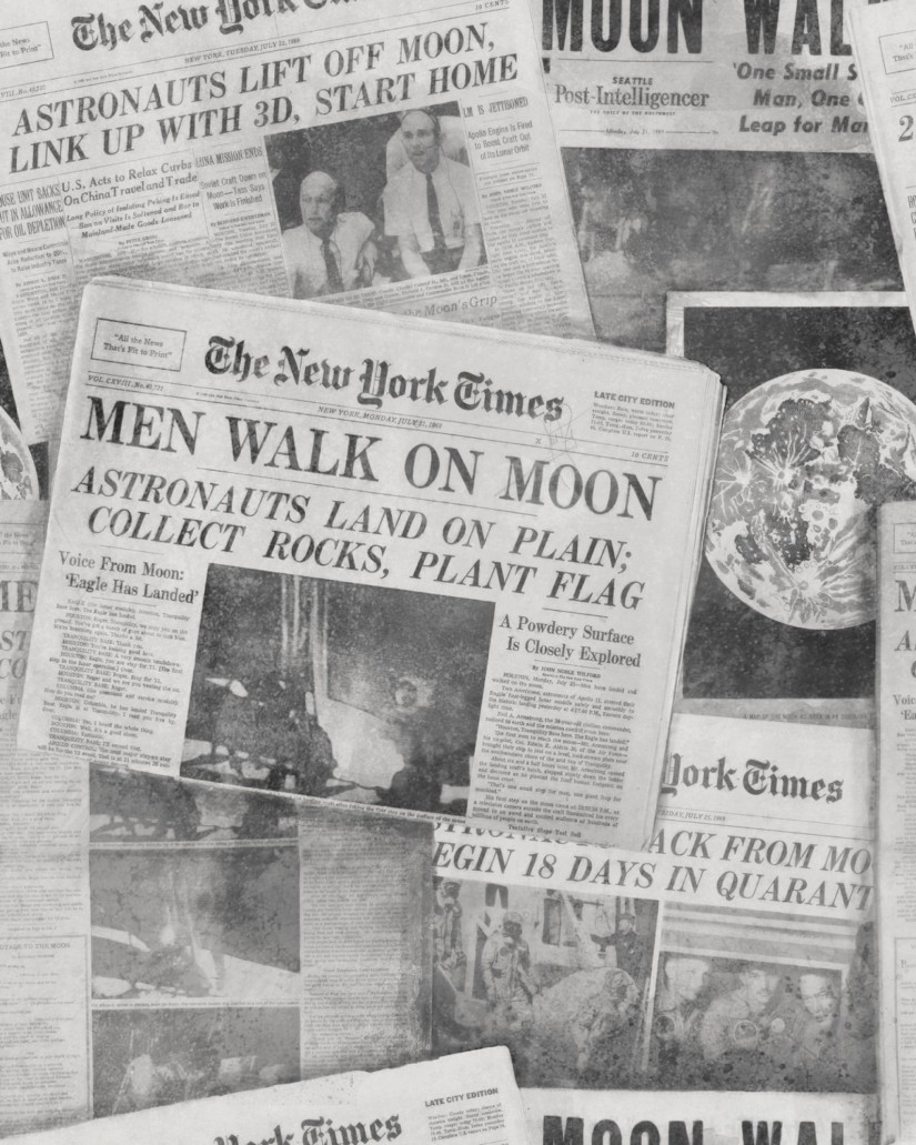 Senovinė laikraščių antraščių, skirtų įamžinti nusileidimą Mėnulyje, kolekcija.