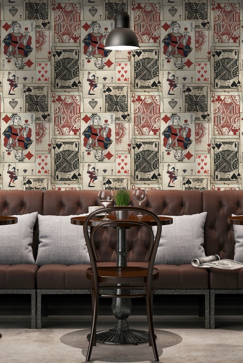 Retro stiliaus tapetai, kuriuose pavaizduotos lošimo kortos.