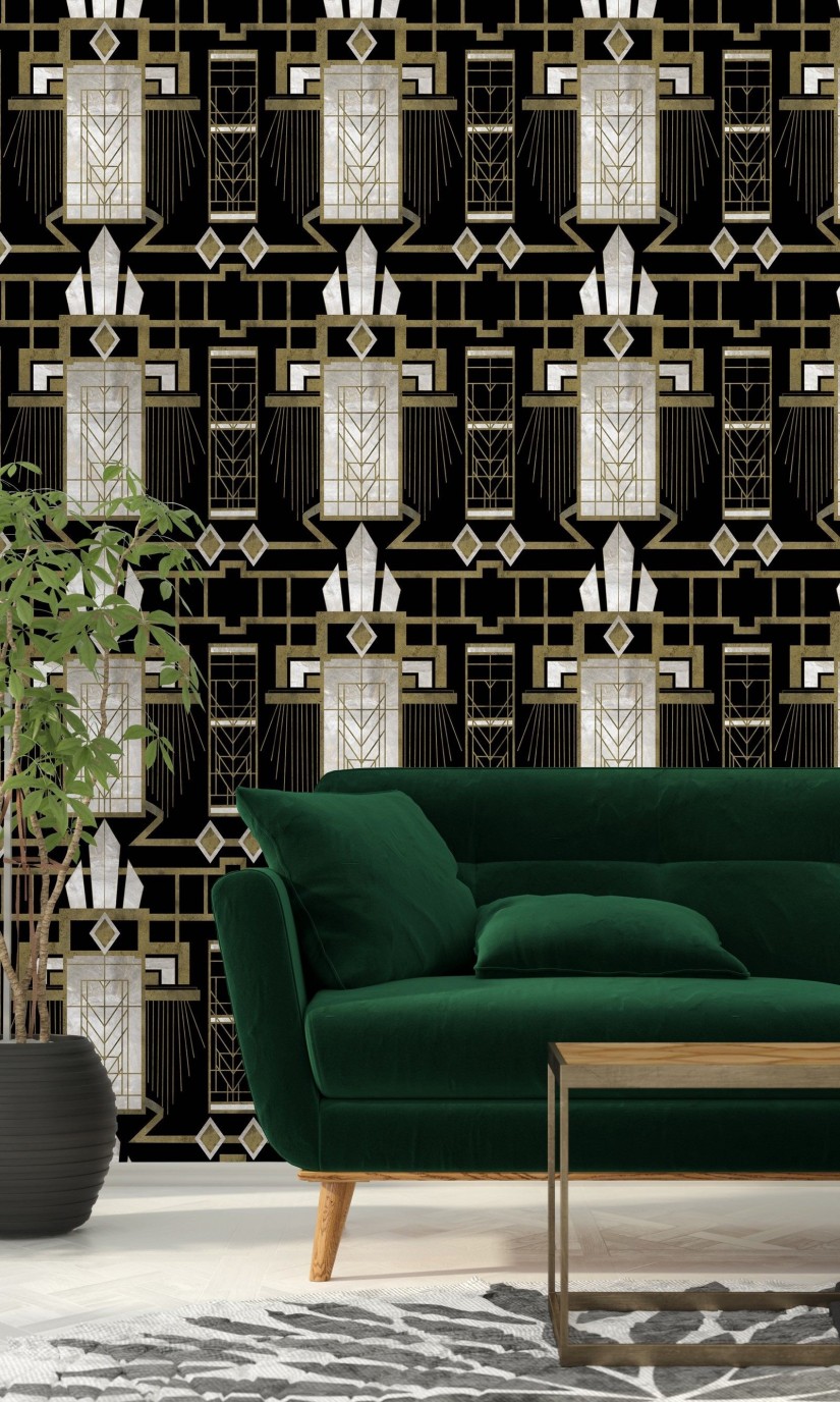 Kerintys tamsių atspalvių tapetai su ryškiomis geometrinėmis figūromis ir metalo akcentais.