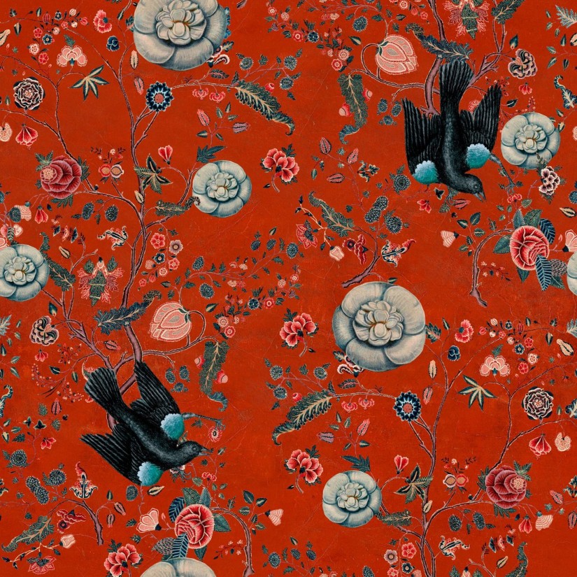 Įdomus meno kūrinys raudoname fone su įspūdingais gėlių motyvais, įkvėptas bohemiško gyvenimo būdo.