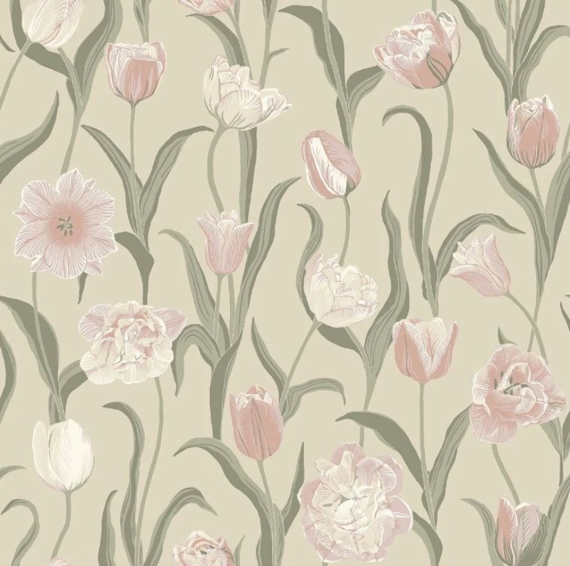 Šie „La Belle Epoque“ tapetai turi svajingą rožinės ir kreminės spalvų tulpių išdėstymą su sidabriškai žaliais lapais smėlio spalvos fone. Įkvėptas klasikinių tulpių rūšių, šis rankomis dažytas ir dažų spauda margintas dizainas suteikia kambariui romantiškumo.