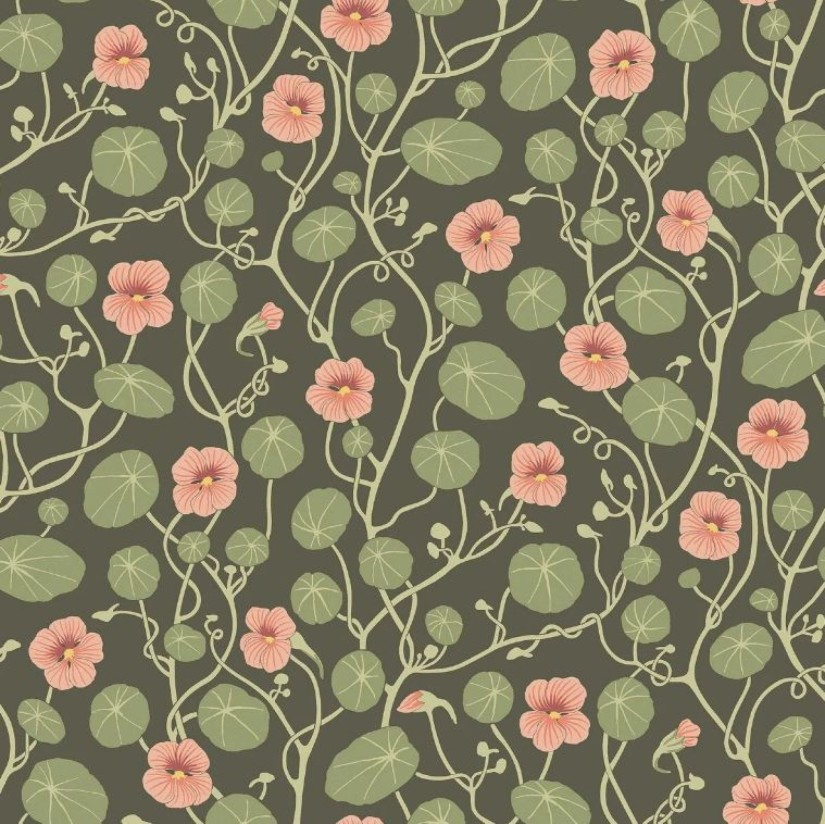 Šioje tamsesnėje „Krasse“ tapetų versijoje yra oranžinių ir raudonų atspalvių gėlės Nasturtės su sodriai žaliais lapais ir stiebais prislopintame tamsių alyvuogių žalios spalvos fone. Ant neaustinio pluošto pagrindo atspausdintas dizainas atskleidžia vingiuojančius augalo stiebus ir ryškias spalvas ir sukuria dramatišką ir dinamišką sienos vaizdą.